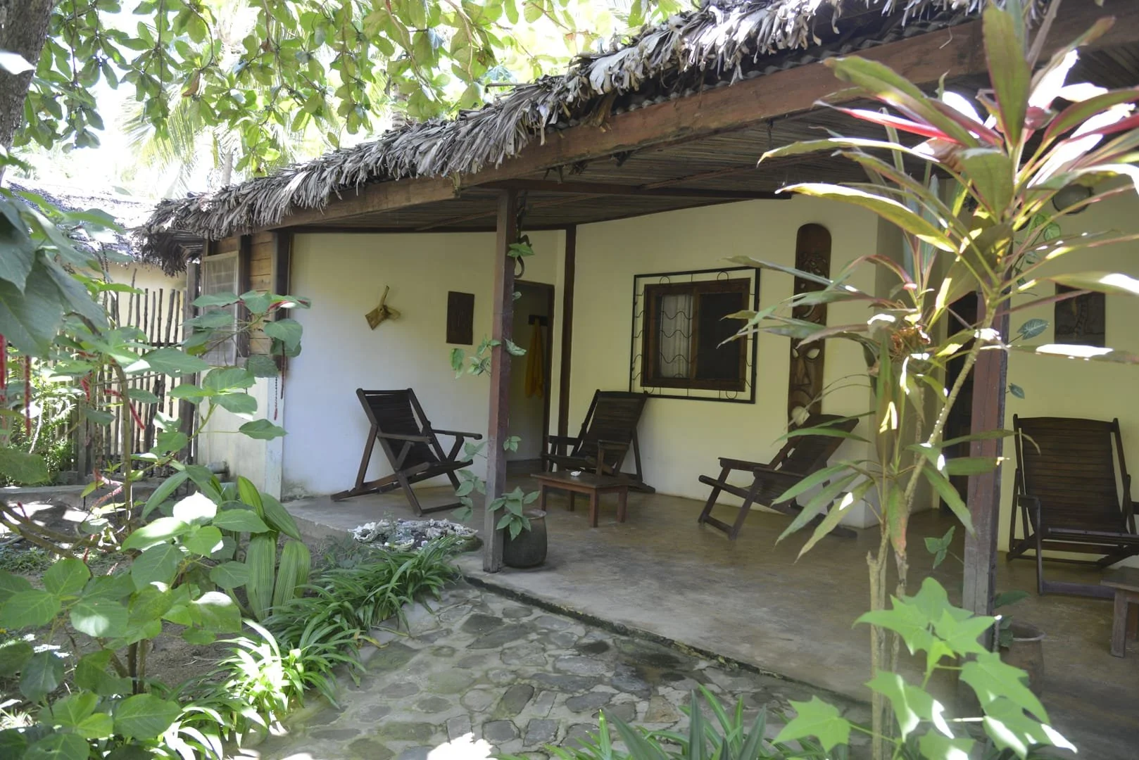Each bungalow includes a double bed with mosquito net, fan, and ensuite bathroom with hot water shower, toilet, and sink.