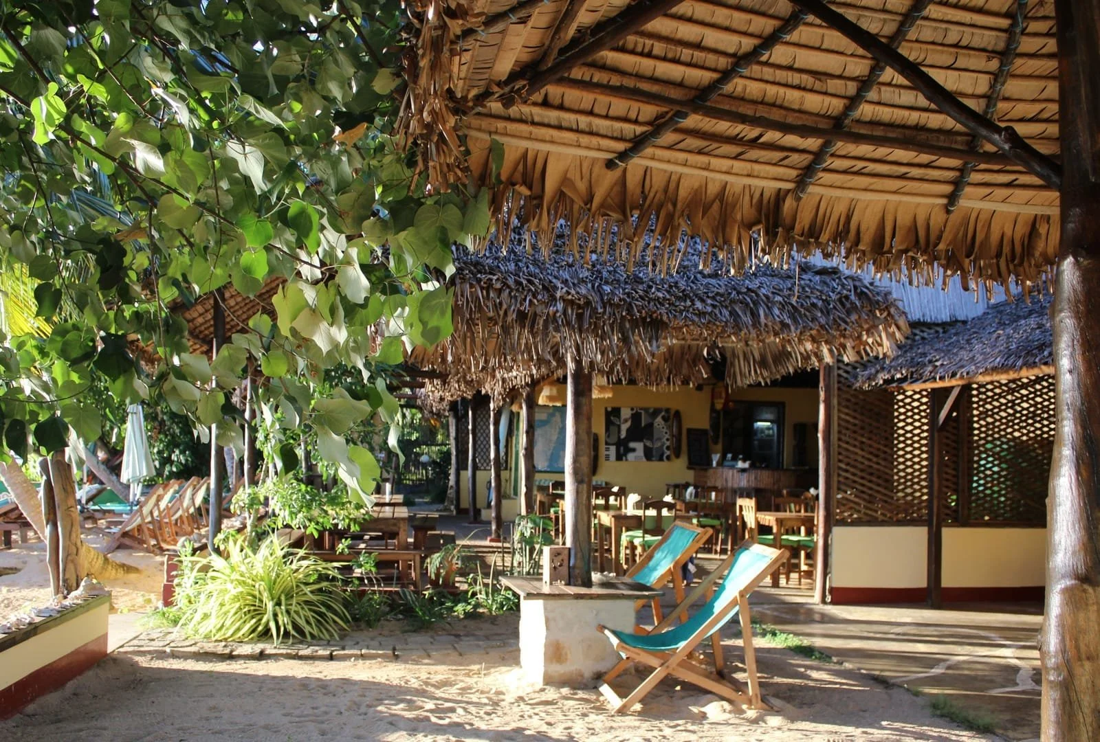 Communal dining brings guests together in a relaxed, sandy‑floor setting.