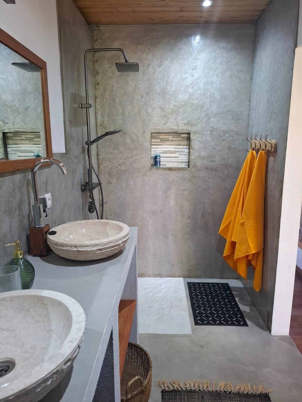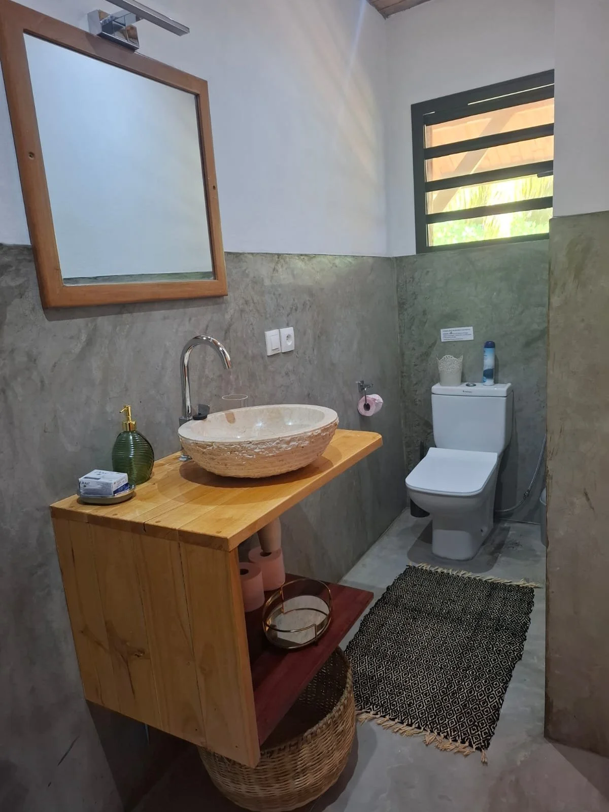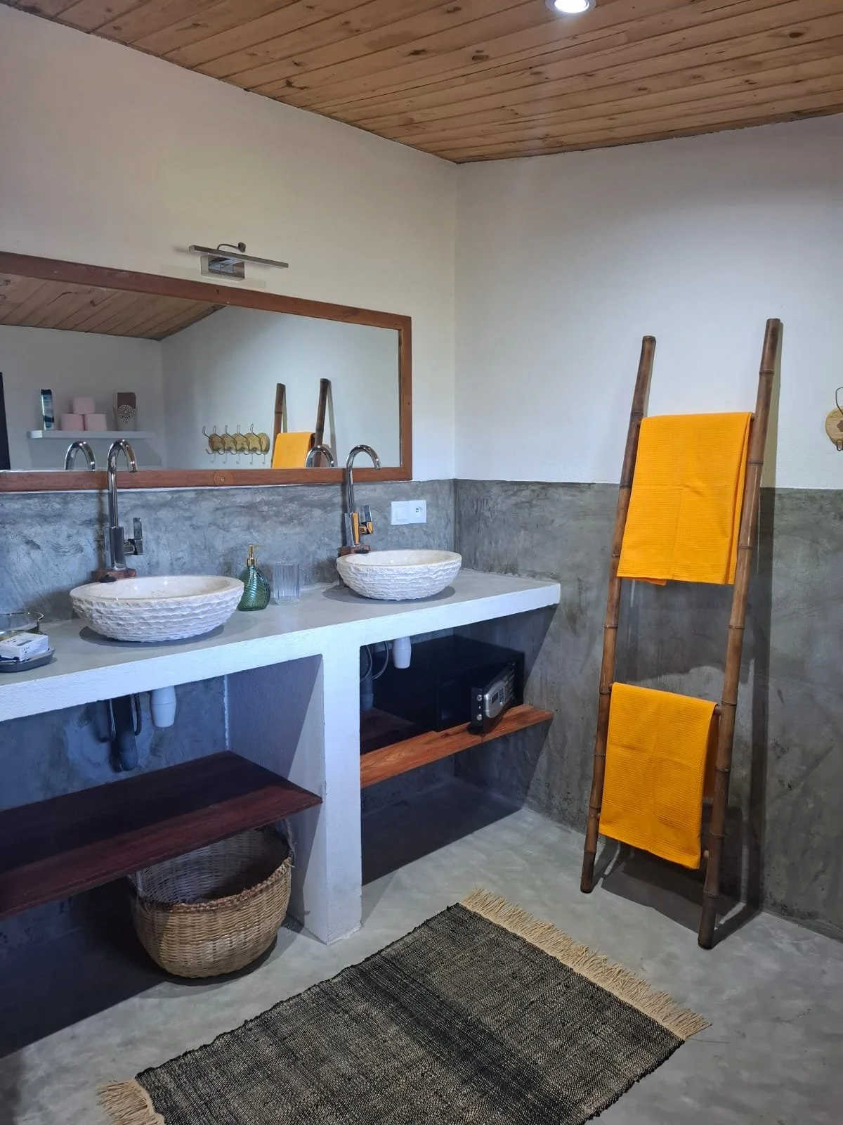 The villa offers three comfortable bedrooms, each with its own ensuite bathroom, air conditioning (between 8 and 10 pm nightly only but there is a lovely sea breeze that comes through the house), and in-room safe — allowing every guest their own private retreat. A separate guest toilet serves the main living areas.